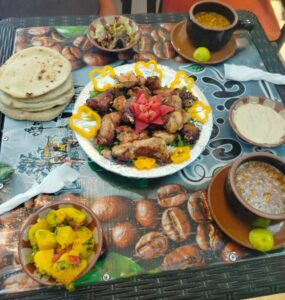 تضم قائمة الأطباق تشكيلة متنوعة من المشويات والكفتة والفراخ المشوية، إلى جانب الفتة والمحشي والمنبار والخضار، وكل طبق يُقدَّم بنكهات مصرية أصيلة تعبّر عن مهارة الطهاة وتميز المطبخ المصري.