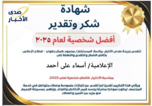 وذلك تقديراً لما قدمته من أداء إعلامي متميز وجهود واضحة في تقديم محتوى إعلامي هادف يجمع بين المهنية والموضوعية.