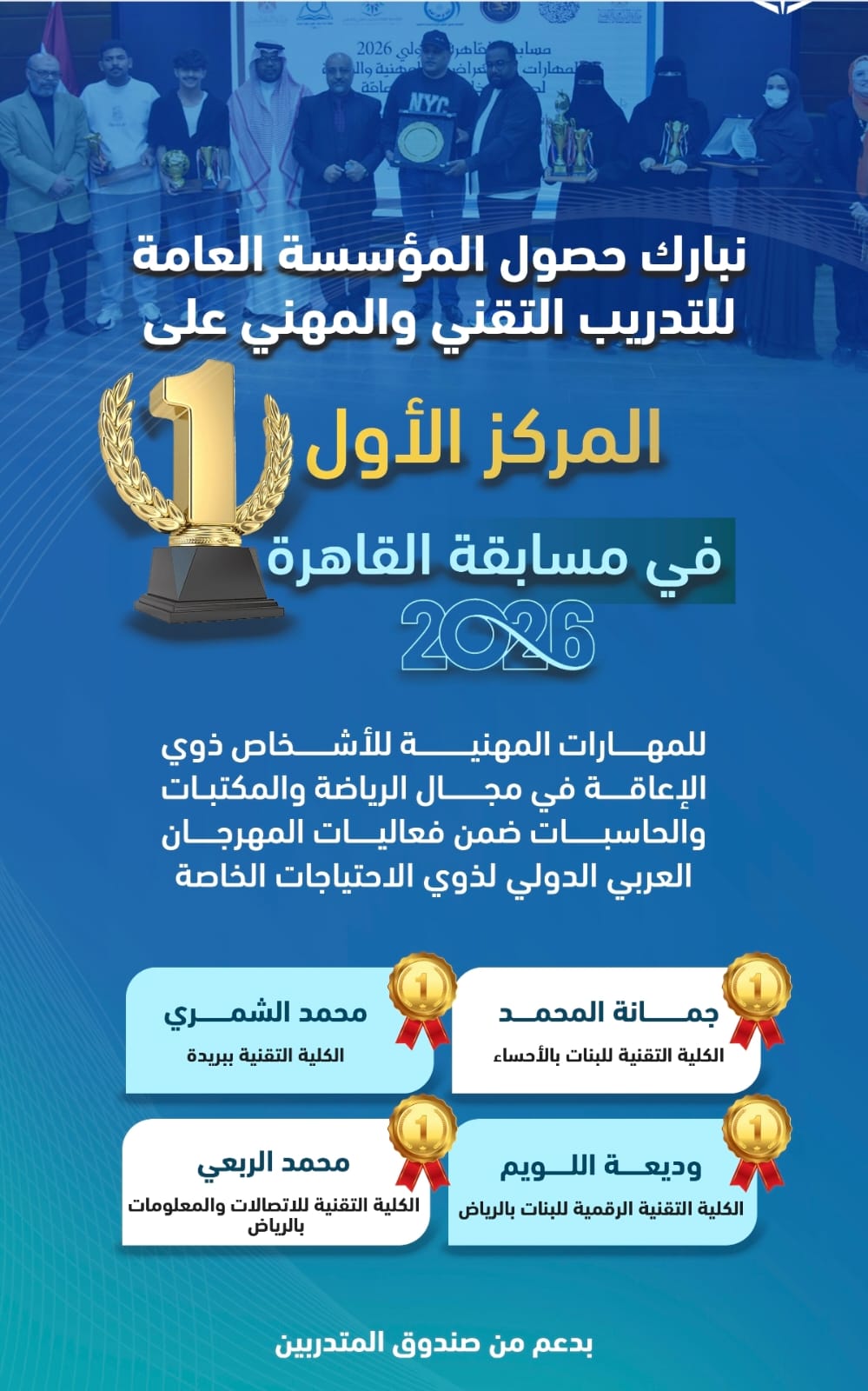 حصدت المؤسسة العامة للتدريب التقني والمهني المركز الأول في مسابقة القاهرة للمهارات المهنية 2026 للأشخاص ذوي الإعاقة، وذلك في مساري “المسابقات الرياضية” و”المكتبات والحاسبات”، ضمن فعاليات المهرجان العربي الدولي لذوي الاحتياجات الخاصة في نسخته السابعة، والمنعقد في الفترة من 28 مارس إلى 3 أبريل الجاري.