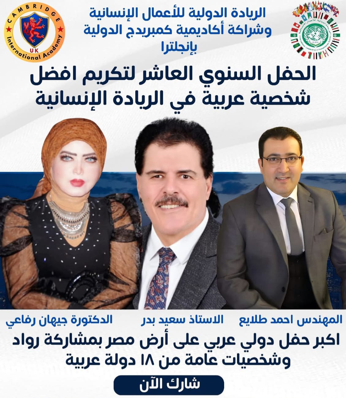 تستعد العواصم العربية لاستقبال حدث فريد من نوعه، حيث تنطلق فعاليات الحفل السنوي العاشر لتكريم أفضل شخصية عربية في الريادة الإنسانية، وهو الحدث الذي بات تقليداً ينتظره المبدعون كل عام. وفي نسخته العاشرة، يكتسي الحفل طابعاً خاصاً برئاسة الأستاذ سعيد بدر، رائد الريادة الدولية، وبالتعاون مع المهندس أحمد طلايع، رئيس أكاديمية كمبريدج الدولية – إنجلترا.