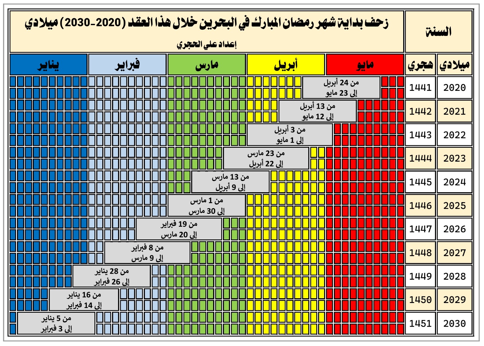 واختتم الفلكي الحجري حديثه موضحاً ما يميز انحسار أنفاس أخر أيام فصل الخريف وبزوغ أول أيام فصل الشتاء بعد أقل من شهر من الآن، بإطلالة تأخر رفع أذان الصبح وتقدم رفع أذان المغرب على أفق البحرين، لتغدو ساعات الصيام أقصر ما يكون طوال العام، وكأنها هدية من رب العالمين للمؤمنين، وهي تمتد على مدى 42 يوماً، وذلك ابتدأ من يوم الأحد القادم 30 نوفمبر 2025 حتى 10 يناير 2026، وهي فرصة سانحة لكل من أراد أن ينهل من بركة الصيام سواءً استحباباً أو قضاءً، فيما أكد الحجري أن شهر رمضان المبارك سيأتي في الأعوام ما بين 2030 و2035 محملاً بأقصر أيام صيامه.