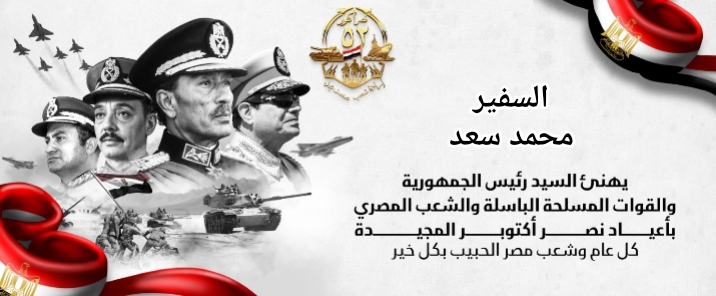 تقدم السفير محمد سعد بخالص التهاني والتبريكات إلى السيد الرئيس عبدالفتاح السيسي، رئيس الجمهورية والقائد الأعلى للقوات المسلحة، بمناسبة الذكرى الـ 52 لانتصارات أكتوبر المجيدة، التي ستظل رمزًا خالدًا للعزة والكرامة المصرية.