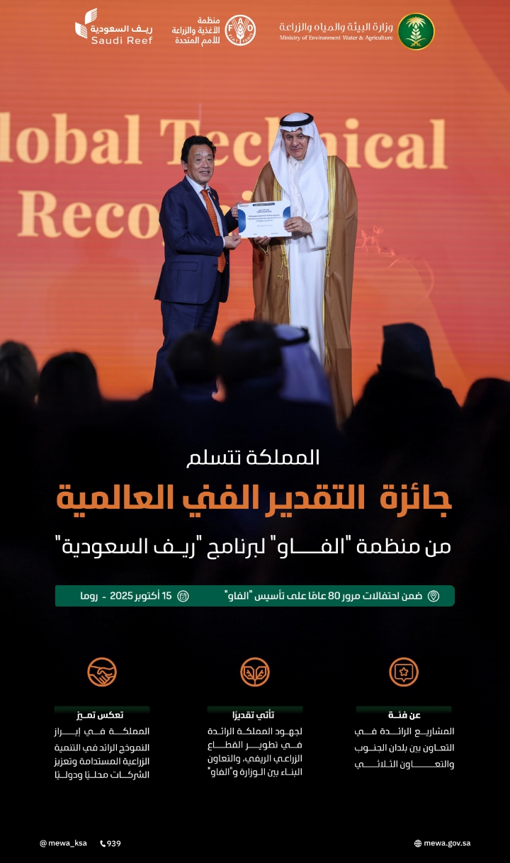 تسلّمت المملكة العربية السعودية اليوم، جائزة التقدير الفني العالمية لمنظمة الأغذية والزراعة للأمم المتحدة “الفاو”، تحت فئة (المشاريع الرائدة في التعاون بين بلدان الجنوب والتعاون الثلاثي)، التي حصل عليها برنامج التنمية الريفية الزراعية المستدامة “ريف السعودية”، كأكبر برنامج تنموي زراعي على مستوى العالم، وذلك لتميزه في تطبيق أفضل الممارسات والمبادرات المبتكرة في تعزيز الأمن الغذائي وحول نظم الأغذية الزراعية.
