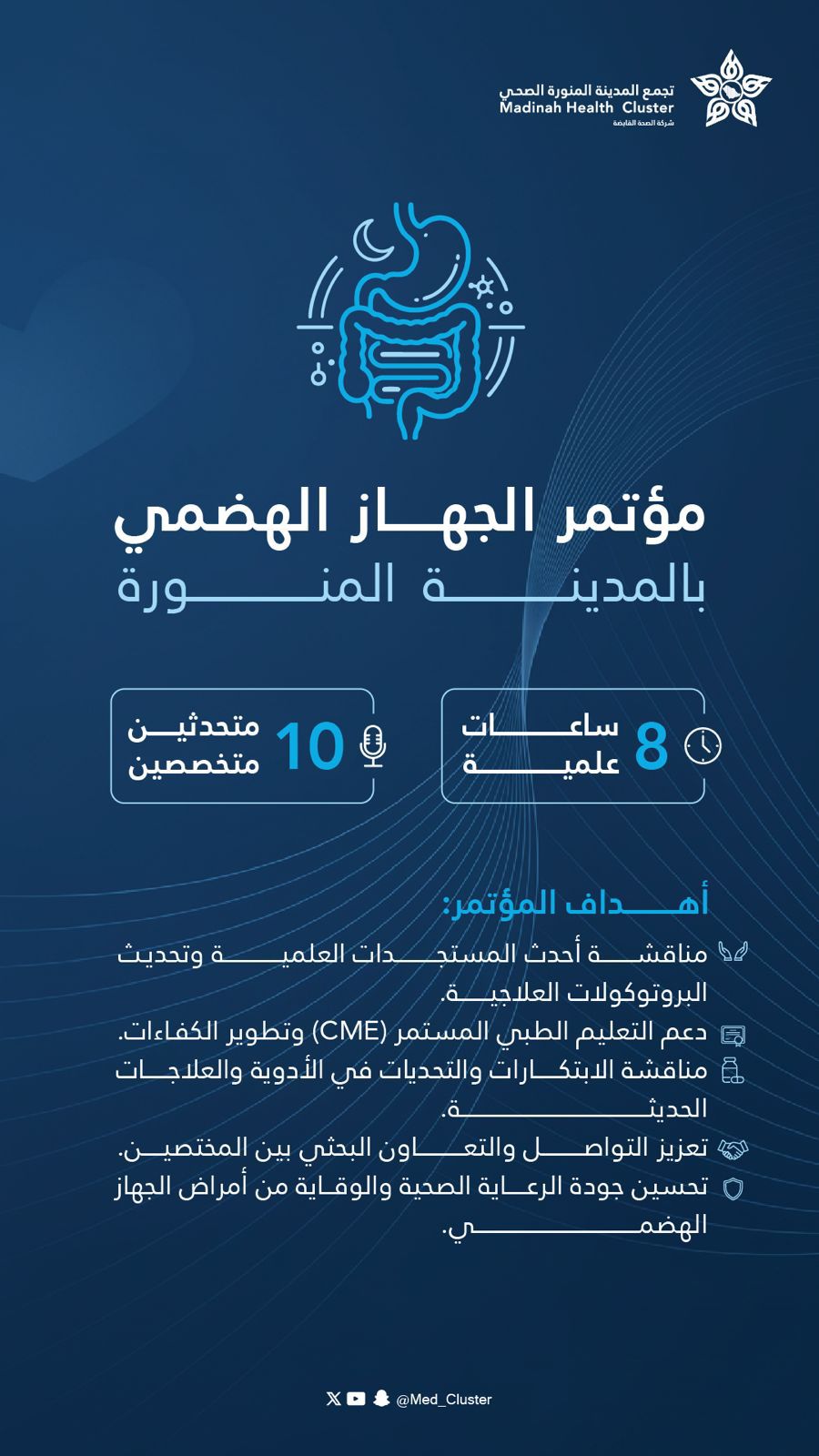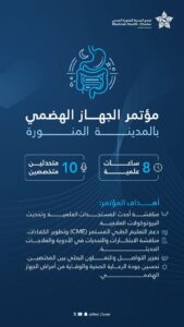 و اوضح تجمع المدينة المنورة الصحي أن المؤتمر يهدف إلى مناقشة أحدث المستجدات العلمية في أمراض الجهاز الهضمي، وتحديث البروتوكولات العلاجية وفق أفضل الممارسات العالمية، إلى جانب استعراض أبرز التحديات والابتكارات في مجالات الأدوية والعلاجات الحديثة.