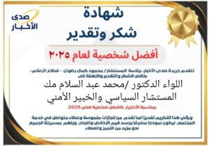 تتقدم أسرة جريدة صدى الأخبار بخالص التهاني والتبريكات إلى اللواء الدكتور محمد عبد السلام مك، المستشار السياسي والخبير الأمني، بمناسبة اختياره كأفضل شخصية لعام 2025، تقديرًا لمسيرته الحافلة بالعطاء والإنجاز في خدمة الوطن.