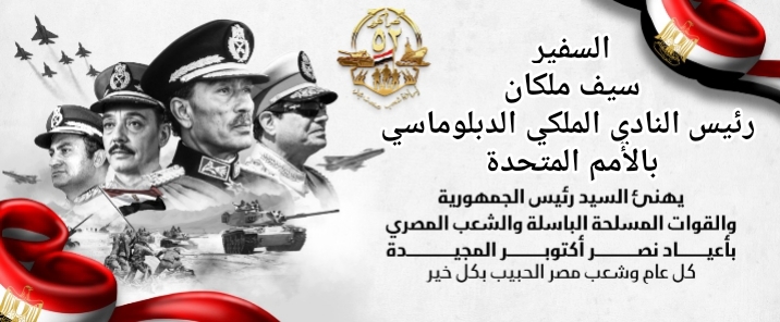 يتقدم السفير سيف ملكان بخالص التهاني والتبريكات إلى فخامة السيد الرئيس عبد الفتاح السيسي، وإلى القوات المسلحة الباسلة، وإلى الشعب المصري العظيم، بمناسبة الذكرى الـ52 لانتصارات أكتوبر المجيدة