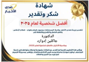 يتقدم المستشار محمود كمال رضوان – قطاع الإعلام بالتحالف الوطني لدعم رئيس الجمهورية ورئيس مجلس إدارة موقع جريدة صدى الأخبار، بخالص التهاني والتبريكات إلى الدكتورة جاكلين إدوارد بمناسبة اختيارها أفضل شخصية لعام 2025، تقديرًا لدورها الرائد وإنجازاتها المتميزة في مجالها الطبي.