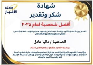 نبارك من القلب للصحفية والإعلامية داليا عادل على حصولها أفضل شخصية لعام 2025، تقديرًا لمسيرتها الرائعة وأدوارها البارزة في الإعلام وخدمة المجتمع!