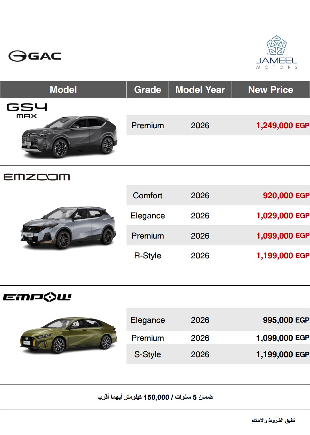 وفي هذا السياق، أعلنت جميل موتورز عن تقديم تخفيضات جديدة على طرازGS3 Emzoom، والذي يتوافر في السوق المصري لموديلات عام ٢٠٢٦ بأربع فئات تجهيزية هي ComfortوElegance و PremiumوR-Style، حيث تبدأ أسعار الفئات بعد التحديث من ٩٢٠.٠٠٠ جنيه مصري لفئة Comfort ، و١.٠٢٩.٠٠٠ جنيه مصري لفئة Elegance، و١.٠٩٩.٠٠٠ جنيه مصري لفئة Premium، و١.١٩٩.٠٠٠ جنيه مصري لفئة R-Style، كما شملت التحديثات السعرية طراز GS4 MAX لموديل عام ٢٠٢٦، والذي يتوافر بفئة تجهيزية واحدة، بسعر ١.٢٤٩.٠٠٠ جنيه مصري.