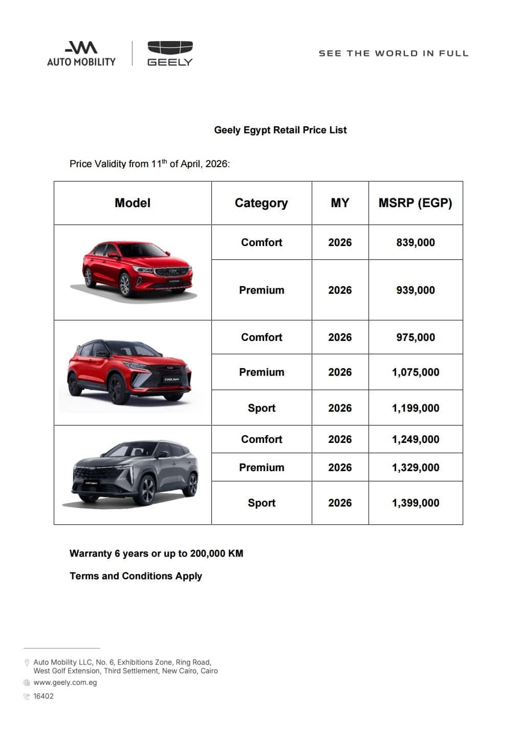 وعوضاً عن مسايرة التوجه العام نحو رفع الأسعار، كشفت “أوتوموبيليتي” عن القائمة السعرية الرسمية والتي شهدت تخفيضاً في بعض فئاتها بالتزامن مع فتح باب الحجز، لتبدأ الأسعار الرسمية للطراز السيدان “إمجراند” من ٨٣٩,٠٠٠ جنيه مصري للفئة الأولى Comfort، وتصل إلى ٩٣٩,٠٠٠ جنيه مصري للفئة الثانية Premium.