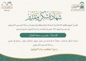 كرمت رئاسة الشؤون الدينية بالمسجد الحرام والمسجد النبوي الشريف الاعلامي الزميل – زهير بن جمعة الغزال – عضو هيئة الصحفيين السعوديين بالاحساء – لجهوده الإعلامية المبذولة وتفانيه في إيصال رسالة الحرمين الشريفين العالمية  في موسم حج 1446 هجرية ولما قدمه من عمل مهني إعلامي مؤثر ساهم في تعزيز رسالة الحرمين الشريفين