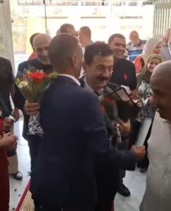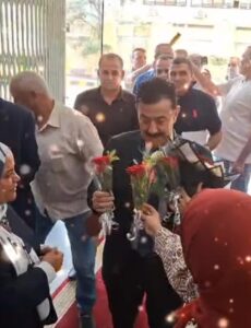 السيد محمد عامر رئيس نقابه الشركه في سابقه فريده من نوعها يستقبل العضو المنتدب بالورد وذلك لتعبير عن الحب والتناغم بين نقابه العاملين والاداره العليا . بالشركه