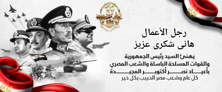 تقدم رجل الأعمال هاني شكري عزيز بخالص التهاني القلبية إلى فخامة السيد الرئيس عبدالفتاح السيسي رئيس الجمهورية، وإلى الشعب المصري الكريم، وقواتنا المسلحة الباسلة، بمناسبة الذكرى المجيدة لانتصارات حرب أكتوبر العظيمة، التي ستظل رمزًا للفخر والعزة والكرامة لكل المصريين.
