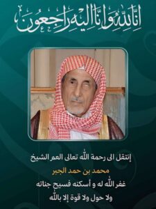 بقلوب مطمئنة و راضية بقضاء الله وقدره انتقل الى رحمه الله عميد أسرة الجبر الشيخ/ محمد بن حمد بن محمد الجبر