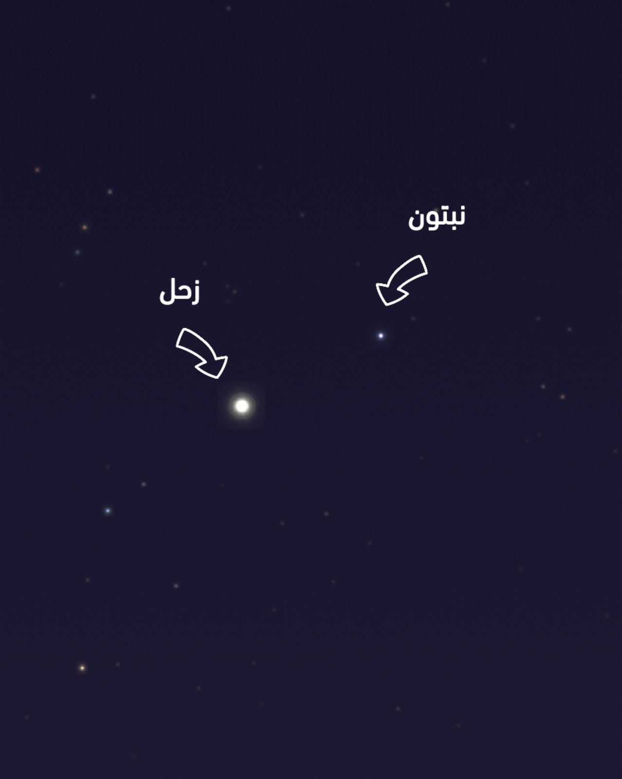 الصورة المرفقة: محاكاة حاسوبية لمشهد الاقتران حيث يظهر نبتون خافتاً في أعلى يمين الصورة ويقع زحل أسفل اليمين كما سيظهران عبر المنظار.